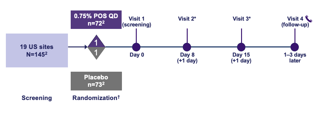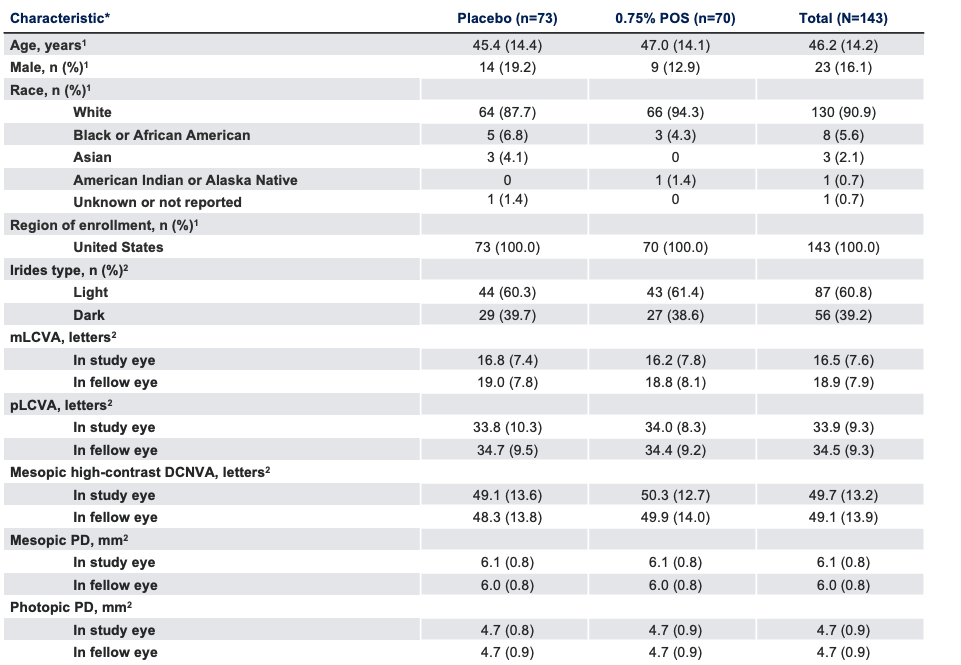 *Data presented as mean (SD), unless otherwise specified.1,2 DCNVA, distance-corrected near visual acuity; mLCVA, mesopic low-contrast distance visual acuity; PD, pupil diameter; pLCVA, photopic low-contrast distance visual acuity; POS, phentolamine ophthalmic solution; SD, standard deviation.