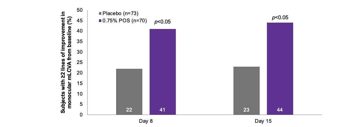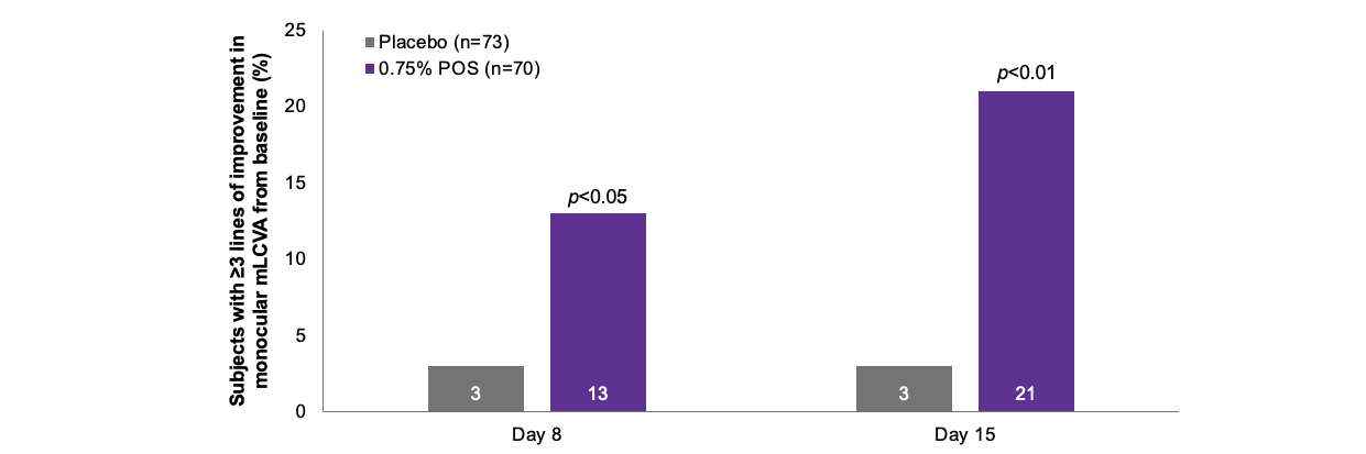 Percentage of subjects with ≥15 ETDRS letters (≥3 lines) of improvement in the study eye in monocular mLCVA from baseline to days 8 and 151,2