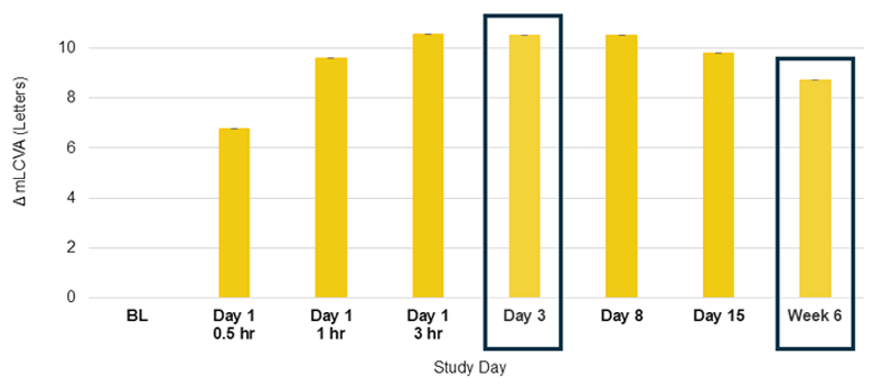 - Mean and change from Baseline (Day 1 pre-dose) in mLCVA and mHCVA at Days 3, 8, and 15 and Week 6