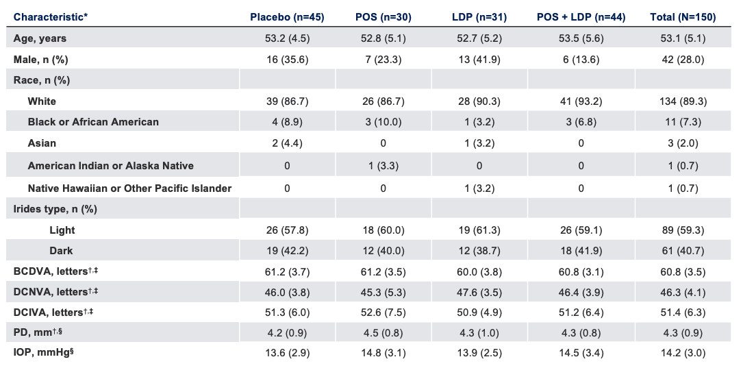 BCDVA, best-corrected distance visual acuity; DCIVA, distance-corrected intermediate visual acuity; DCNVA, distance-corrected near visual acuity; IOP, intraocular pressure; LDP, low-dose pilocarpine; PD, pupil diameter; POS, phentolamine ophthalmic solution; SD, standard deviation.