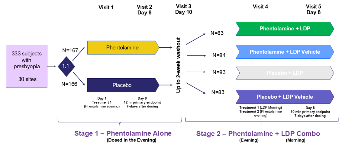 BCDVA, best-corrected distance visual acuity; DCNVA, distance-corrected near visual acuity; POS, phentolamine ophthalmic solution 0.75%; LDP, low dose pilocarpine. https://www.clinicaltrials.gov/study/NCT05646719.