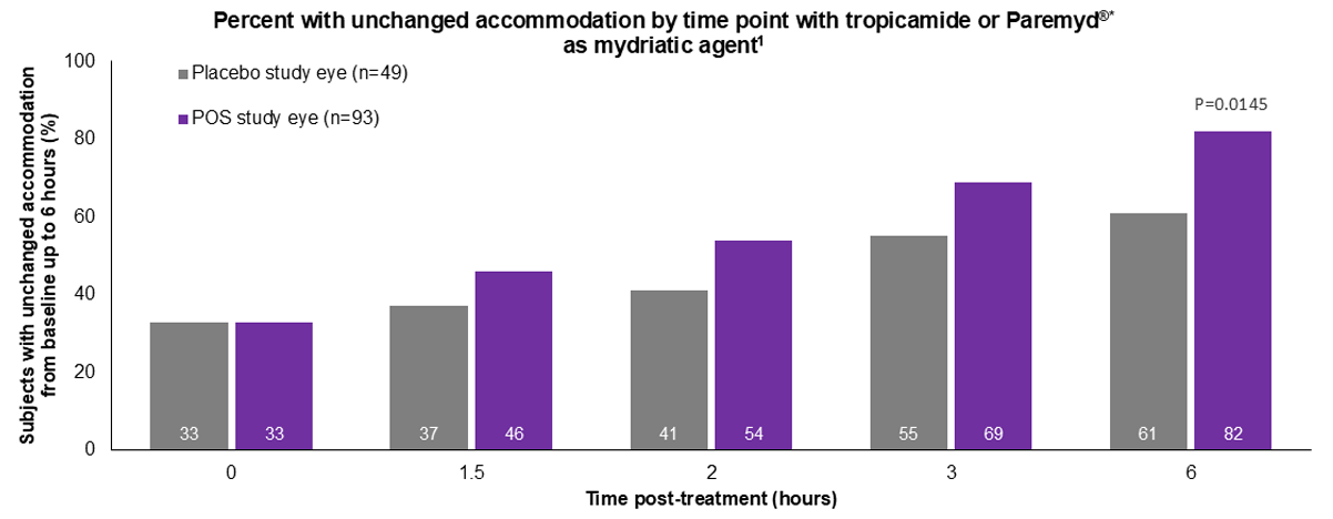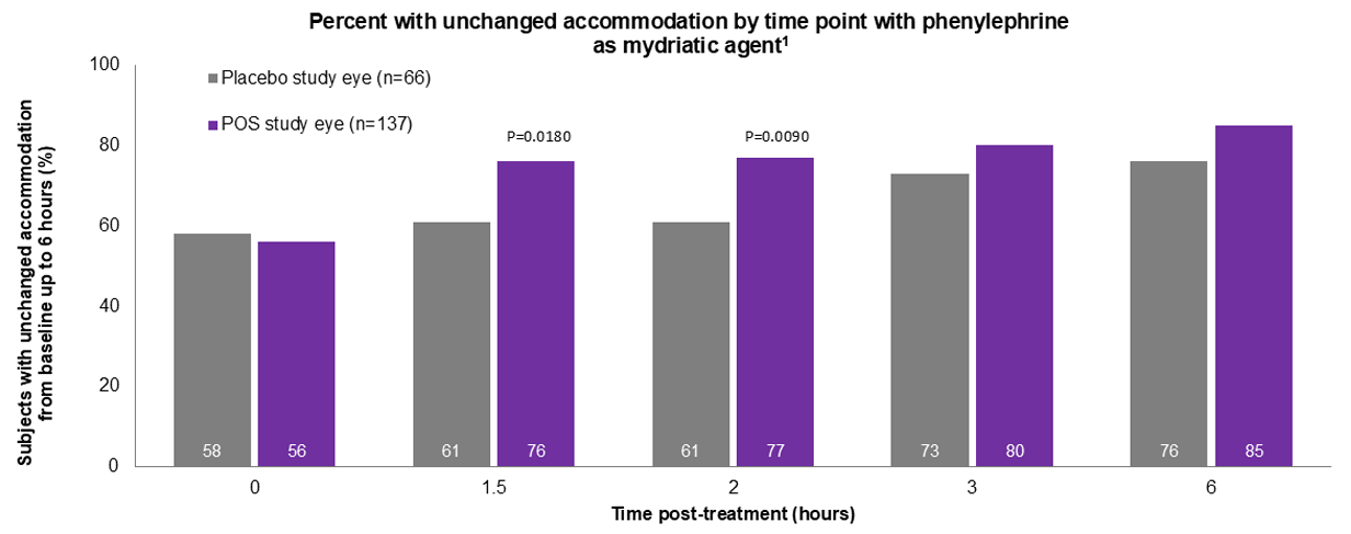 The PP population included all subjects in the mITT population who had 2 drops of study medication in their study eye, had all scheduled PD measurements during visit 1, had an increase of >0.2 mm in PD in the study eye at time 0 min compared to baseline (-1 hr), and had no major protocol deviations. The PP population was used to analyze selected secondary efficacy endpoints, with subjects included in their randomized treatment regardless of the treatment they actually received.1mITT, modified Intention-to-Treat; PP, per-protocol; PD, pupil diameter; POS, phentolamine ophthalmic solution 0.75.
