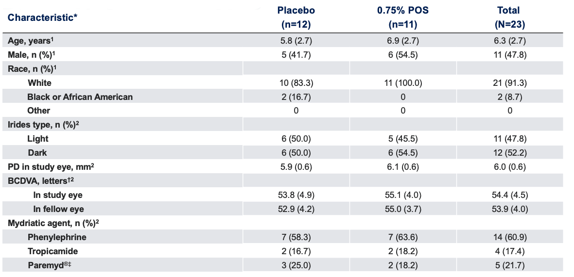 *Data presented as mean (SD), unless otherwise specified;1,2 †For BCDVA, the number of letters read is from the 4-meter distance only, so that 55 letters read is equivalent to a Snellen acuity of 20/20.2 ‡Paremyd is a registered trademark of Akorn, Inc.BCDVA, best-corrected distance visual acuity; PD, pupil diameter; POS, phentolamine ophthalmic solution; SD, standard deviation.