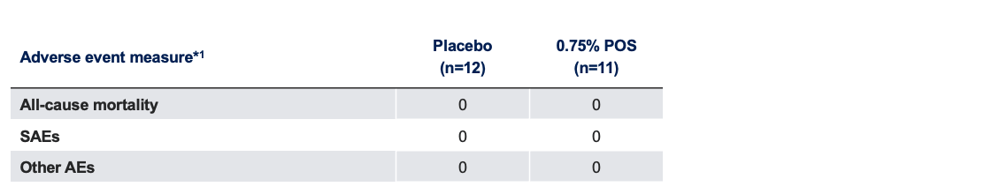 - BCDVA: One study eye in the POS 0.75% group lost ≥5 letters in BCDVA at 0 min; no other study eyes lost ≥5 letters in either treatment group at any time point