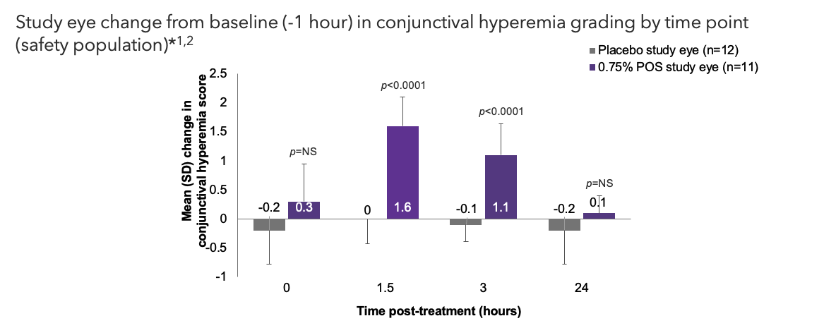 - At baseline (-1 hr), mean (SD) conjunctival hyperemia score was 0.4 (0.50) in study eyes treated with 0.75% POS and 0.8 (0.39) in study eyes treated with placebo2