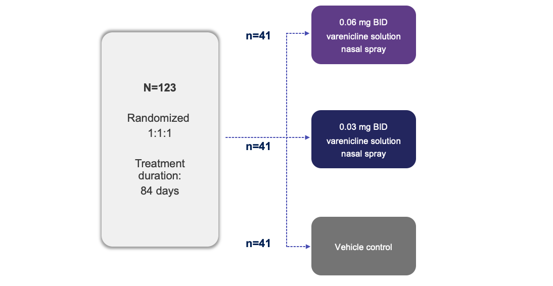 Note: The FDA-approved dosage of varenicline solution nasal spray is 0.03 mg BID.2