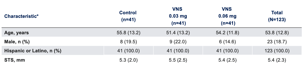 Note: The FDA-approved dosage of varenicline solution nasal spray is 0.03 mg BID.2 *Data presented as mean (SD), unless otherwise specified.