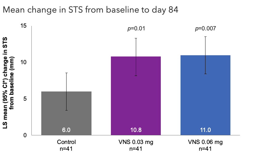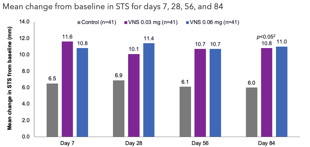 Note: The FDA-approved dosage of varenicline solution nasal spray is 0.03 mg BID.3 Analyzed using an ANCOVA model with baseline STS and treatment group as covariates. All comparisons made with the control group.2 VNS 0.03 mg group mean baseline STS 5.5 mm (n=41); VNS 0.06 mg group mean baseline STS 5.4 mm (n=41); control group mean baseline STS 5.3 mm (n=41).1 All randomized and treated patients were included in the analysis and missing data were imputed using last-available data.1,2