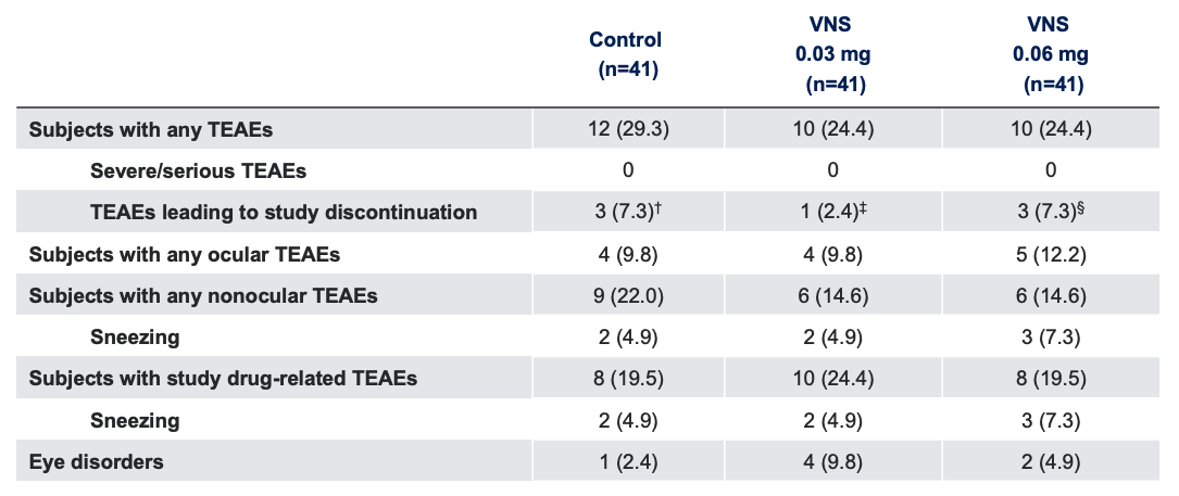 BCVA, best-corrected visual acuity; FDA, Food and Drug Administration; TEAE, treatment-emergent adverse event; VNS, varenicline solution nasal spray.